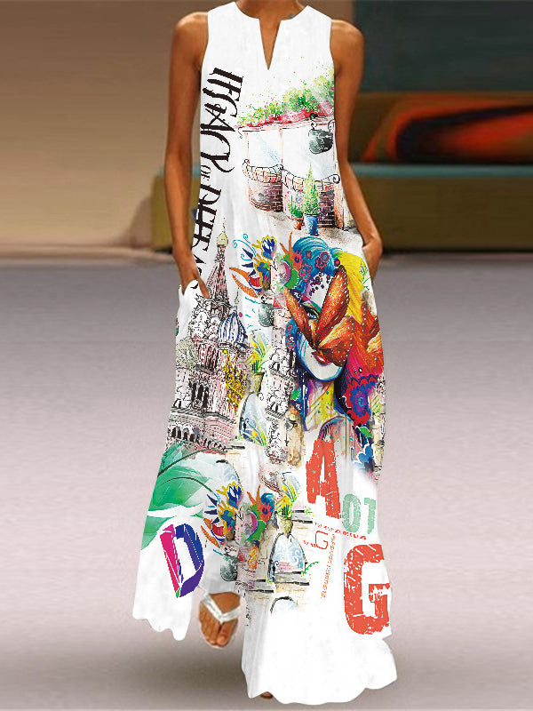 Printed V-Neck Sleeveless Summer Sexy Dress