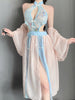Design:ThisExotic Stripper Lingerie Set featuring a cut-out sheer mesh dress. traditional chinese buckle collar. front floral embroidery. back opening and a tie back closure. and a breezy skirt with draping panels.
