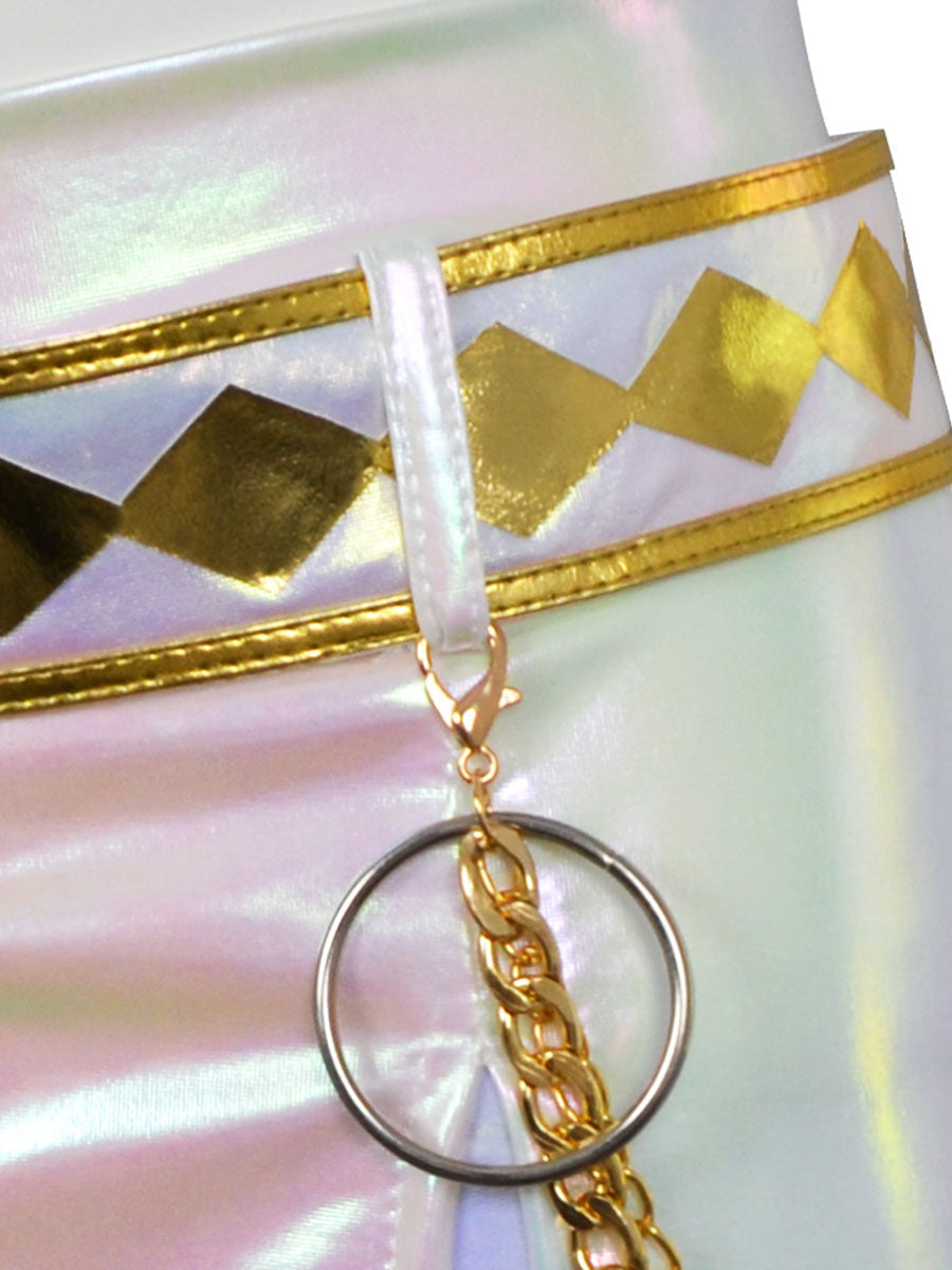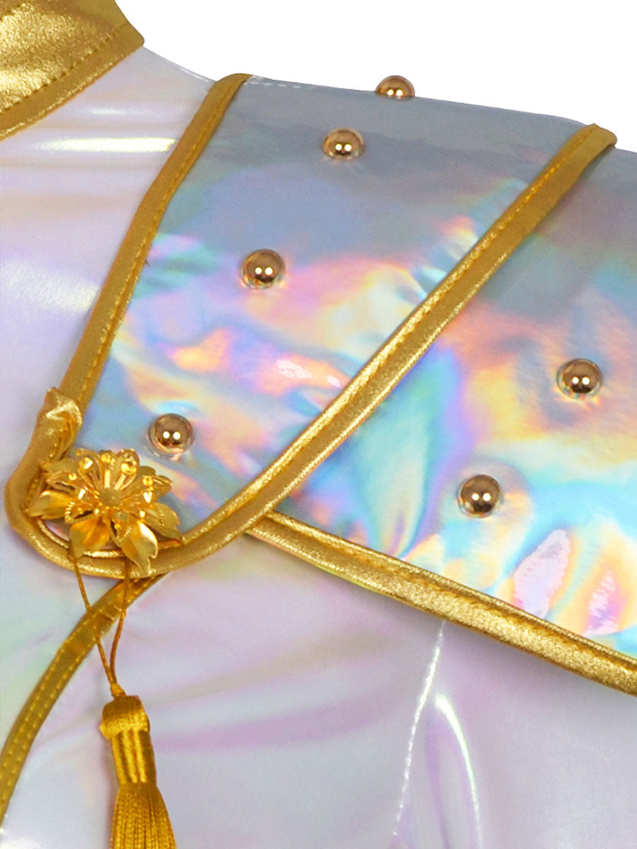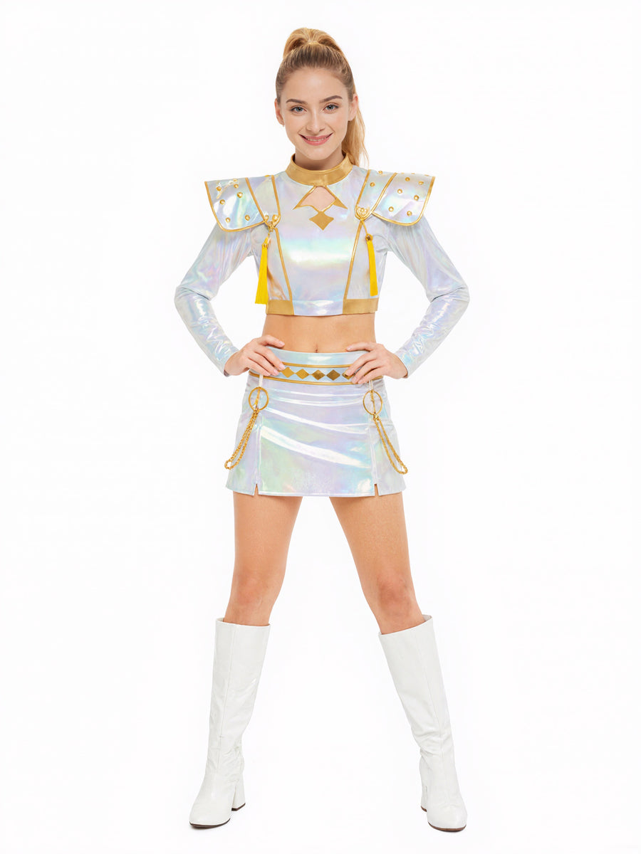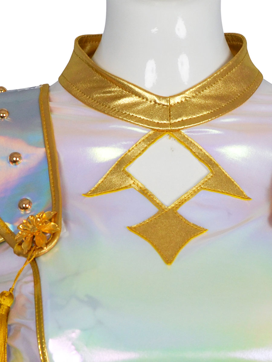 Design: Anime Super Idol Costumefeaturing a cropped long-sleeve jacket. bold shoulder epaulets with gold tassels. a fitted silhouette. and a matching high-waisted mini skirt with a golden sash. restores the roles character.