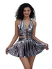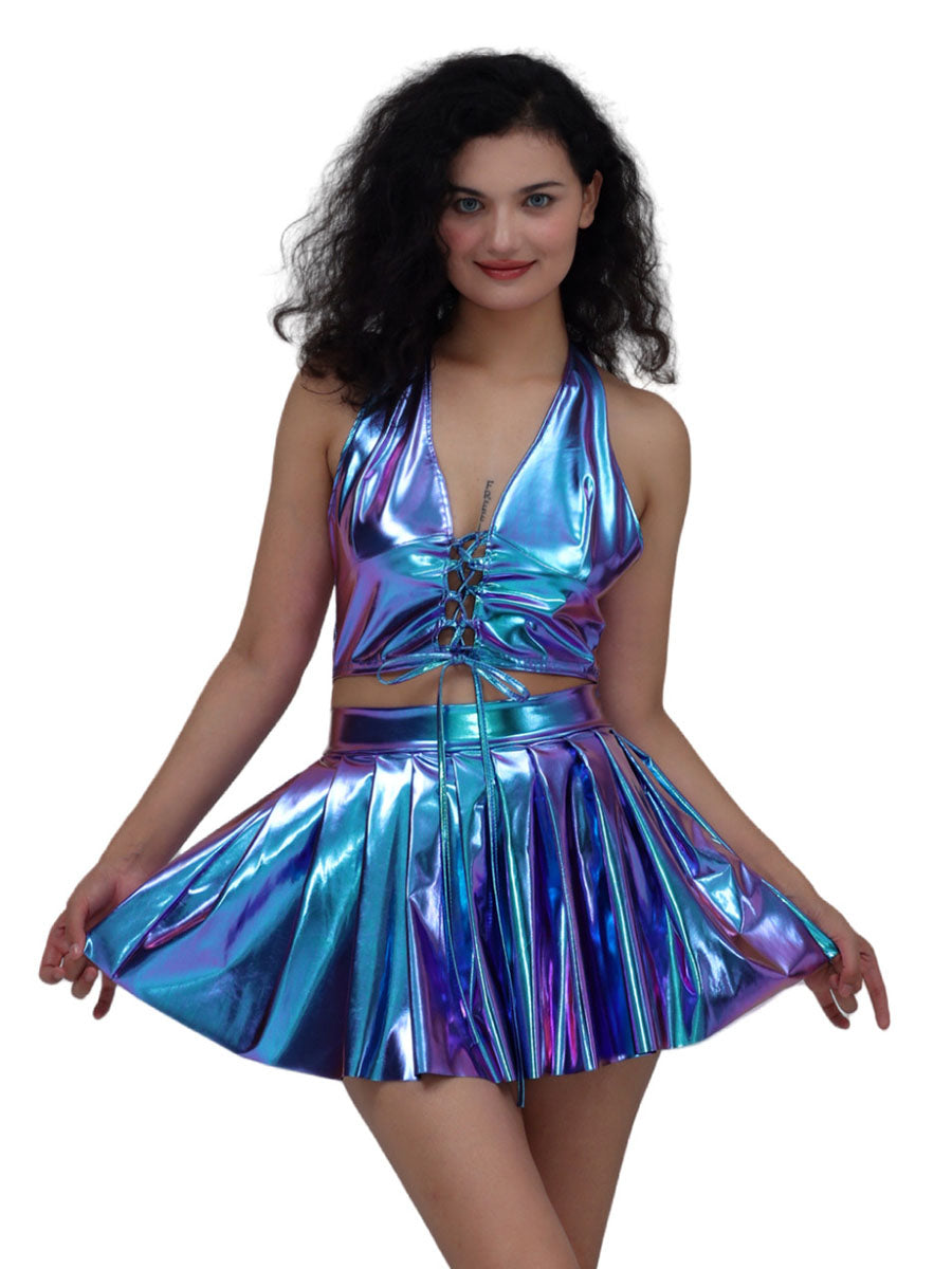 Design: AOSIG metallic two piece skirt set featuring a halter crop top with front lace-up closure. and a matching high-waist pleated mini skirt offer a flattering silhouette that combines futuristic style with playful confideAS-e.